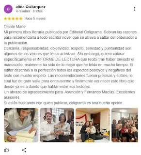 Alida Quilarquez, autora de Caligrama Editorial, dejó una reseña entusiasta en Google que pone de relieve la experiencia y profesionalidad de Editorial Caligrama. Se deshace en elogios sobre la atención personalizada, la comunicación oportuna y el informe de lectura exhaustivo y perspicaz que recibió. Como autora primeriza, encontró que los comentarios eran inestimables para perfeccionar su manuscrito y, en última instancia, dar vida a su libro. También elogia a Asunción y Fernando Macías, a quienes cita como asesores excelentes.